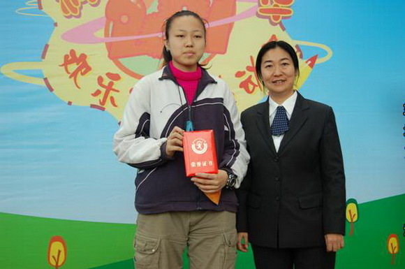 深圳市少年科学院副院长、深圳市少年宫唐青书记向张悉妮同学颁发少年科学院院士证书
