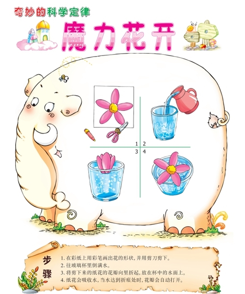 原理:纸花瓣会展开,这是水的毛细现象的表现,当纸吸收的水达到折痕处的时候,水使纸的纤维膨胀,纸花瓣就自动展开了。
