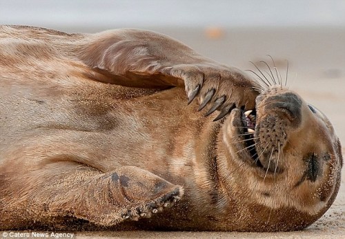 据人们猜测,海豹张开嘴“笑”的神情也许是从冰冷的海水中爬到沙滩上后呈现的痉挛表情。